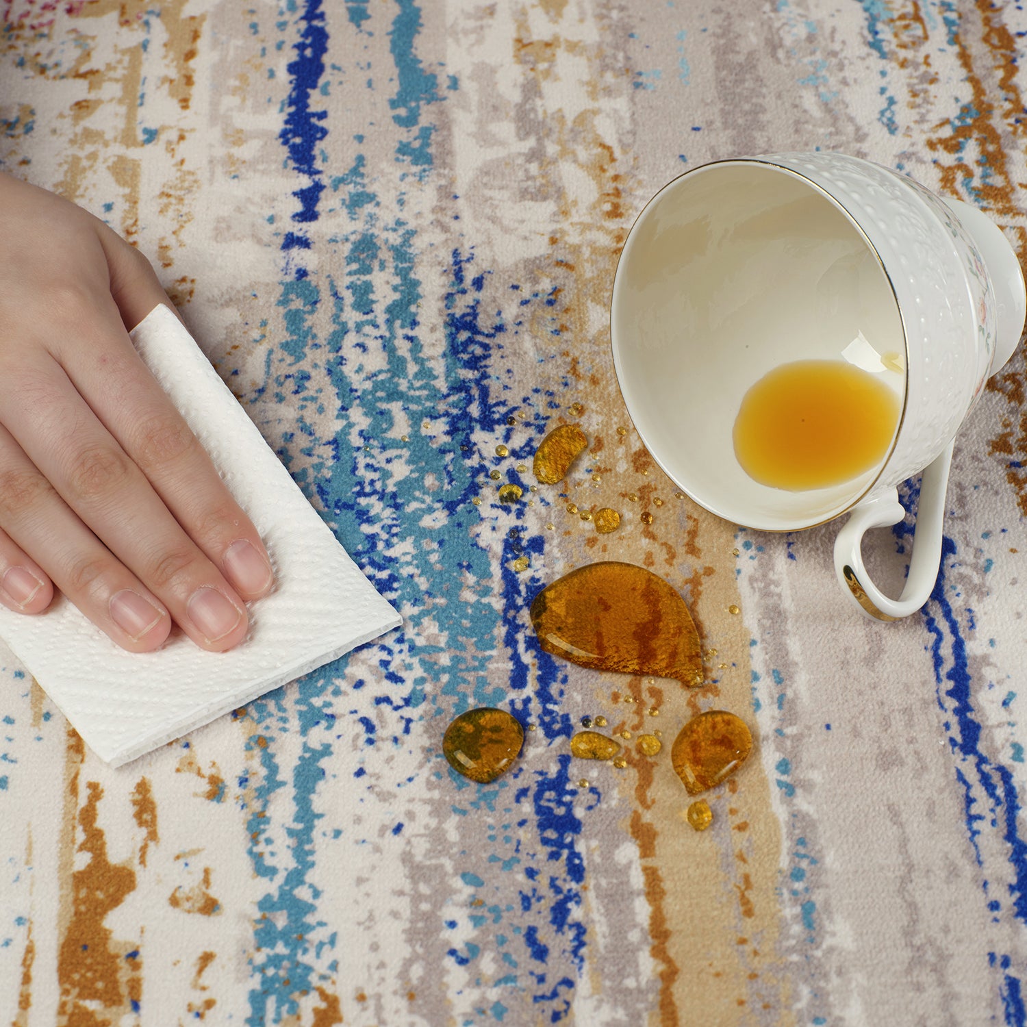 This bold abstract rug brings a burst of color to any room with vibrant streaks of pink, blue, gold, and white set against a neutral background. Perfect for contemporary or eclectic spaces, it serves as a striking centerpiece while remaining practical for busy homes. Featuring a liquid-resistant surface, non-slip backing, and a low 0.28" pile, it’s both comfortable underfoot and easy to maintain, with machine-washable convenience for effortless care.