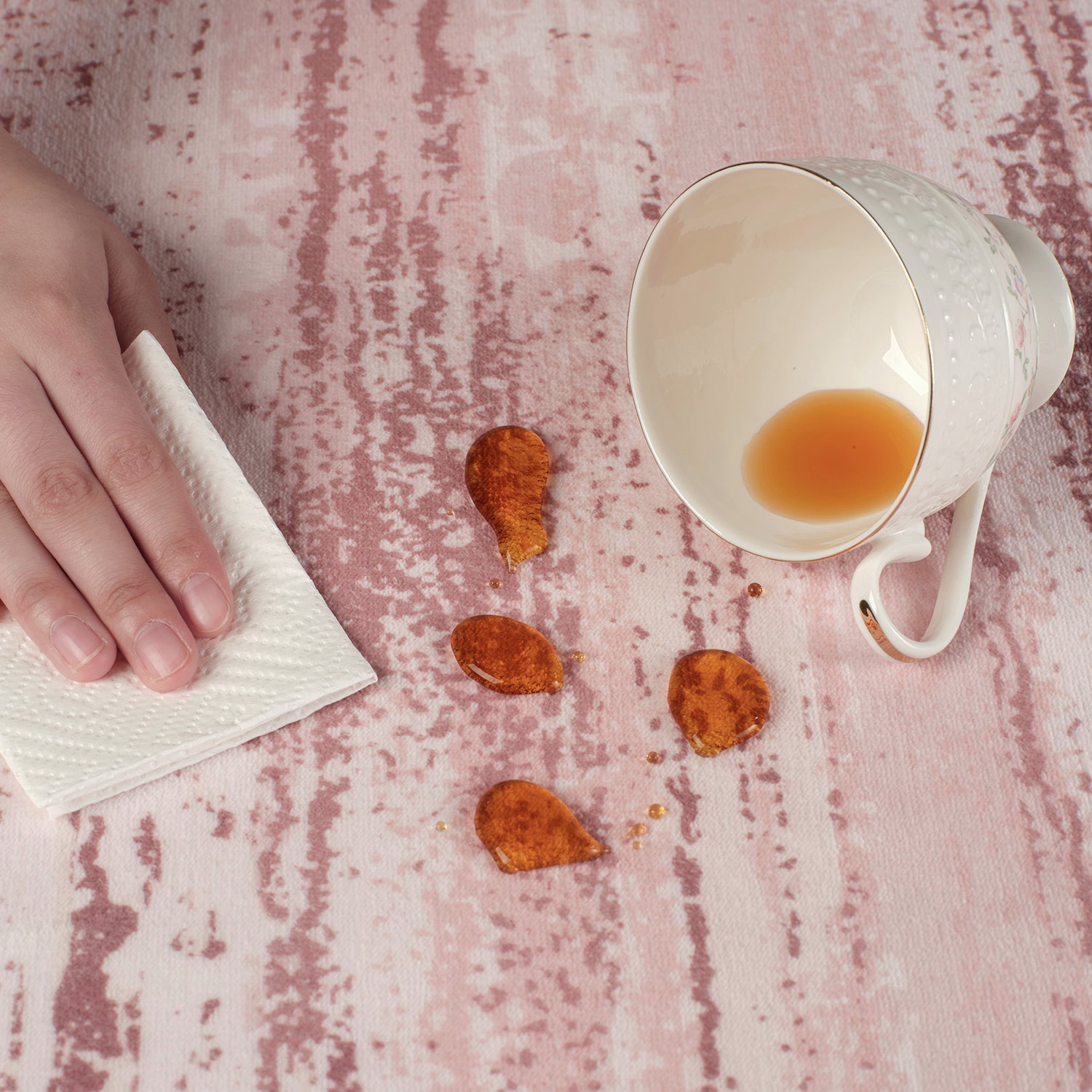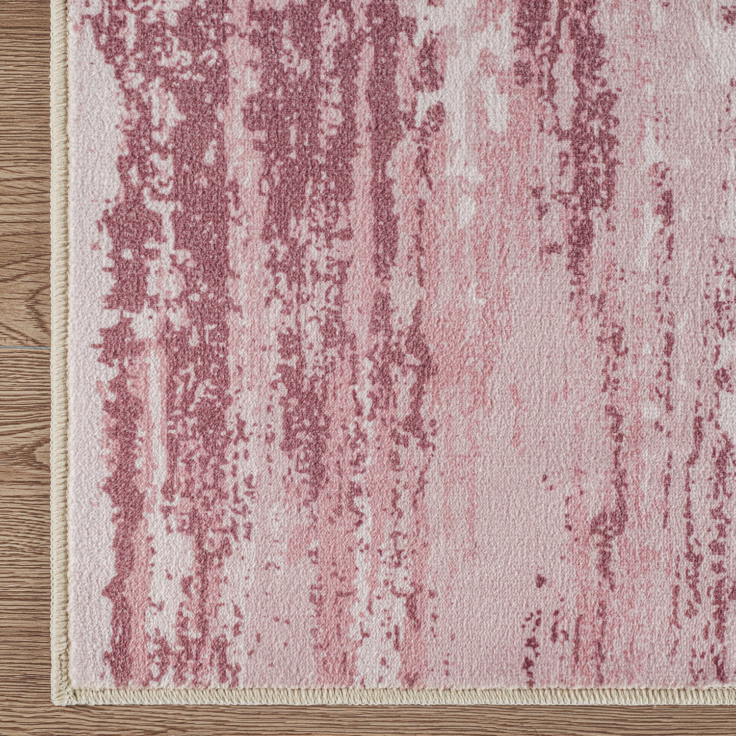 With soft blush, rose, and cream tones, this rug features painterly stripes that add warmth and charm to any room. Perfect for contemporary or bohemian spaces, its earthy hues create a serene and inviting atmosphere. Designed for both style and practicality, it has a liquid-resistant surface, non-slip backing, and a low 0.28" pile for comfort underfoot. Machine washable for easy care, this rug combines effortless elegance with everyday functionality.